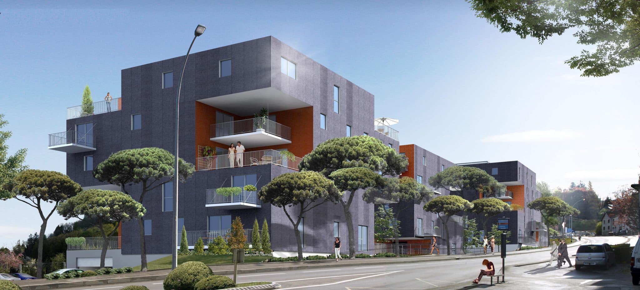 Le projet s’inscrit dans le cadre d’une démarche environnementale et « intimité des habitants ». Il se présente sous forme de 4 plots en R+4 qui semblent flotter sur la parcelle.
